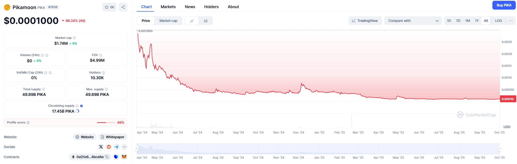 - Listings & liquidity: PIKA is listed on multiple exchanges and DEXes. Liquidity is uneven across venues; 24-hour volumes are low relative to large-cap tokens, so trades can experience wide spreads and slippage.